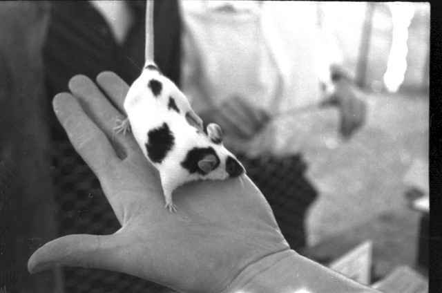 The broken shown above became a champion several times during 1969, although the owner became upset when some exhibitors started suggesting that his winner had even ears. Three photographs were secretly taken (the mouse was taken out of the Maxey cage at the Liverpool show in July 1969 when everyone was at lunch and photographed) and are published here for the first time. The photographs do not totally support the argument either way. It can be seen that the mouse has markings on both ears (which suggests even ears) but one marking is bigger than the other. The other two photographs appear below.