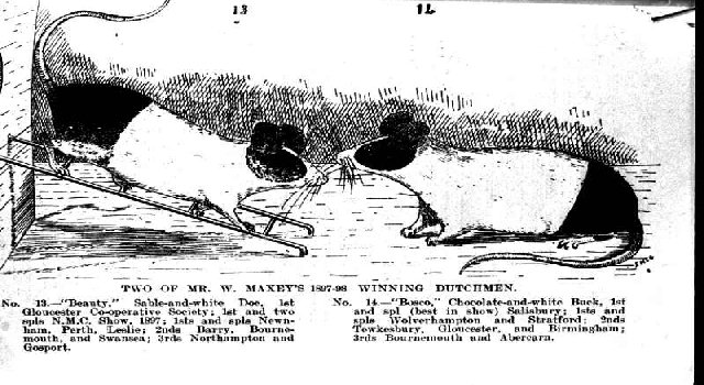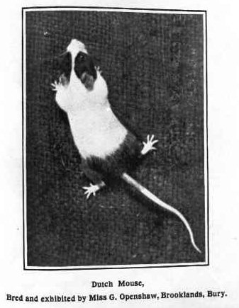 Another reason for doubting the accuracy of the drawings is this photograph of a Dutch mouse owned by Miss G Openshaw was being shown at the same time as Walter Maxey's Dutch mice. Miss Openshaw's mouse is very similar in markings to the present-day Dutch pictured above. This suggests that Walter Maxey's Dutch mice didn't look their picture, and Dutch mice haven't improved much in 100 years! (unless Miss Openshaw's mouse was an exception)
