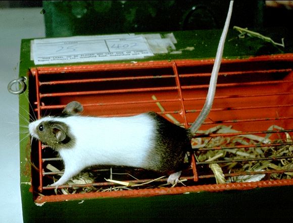 Below are two photographs of Black Dutch. The head markings can be seen clearly. They are not perfect but are better than the Agouti Dutch. The blaze (space on the head between the markings) is a but uneven, but the cheeks don't (quite) creep into the whisker beds. Neither photograph shows the best view of the saddle, but it is obviously slipping. It should come up to the the mouse's middle (although, in practice, they never do).